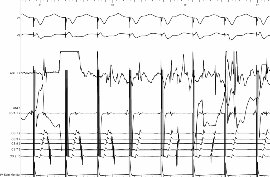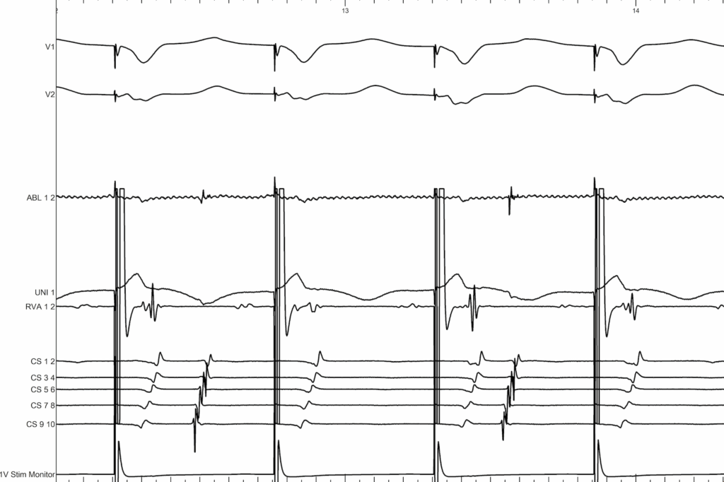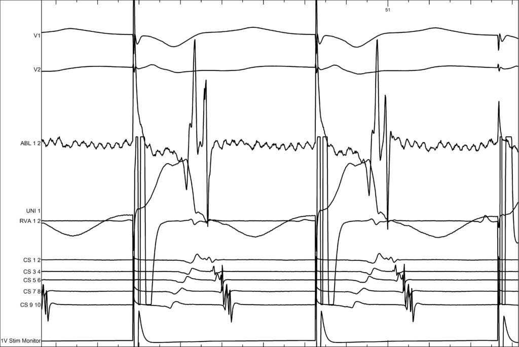 Here we are pacing at the ventricular level. We first see the activation of the CS progressing from CS1,2 toward CS9,10, and immediately after the application there is a change in activation, which becomes normal again, from CS9,10 toward CS1,2.