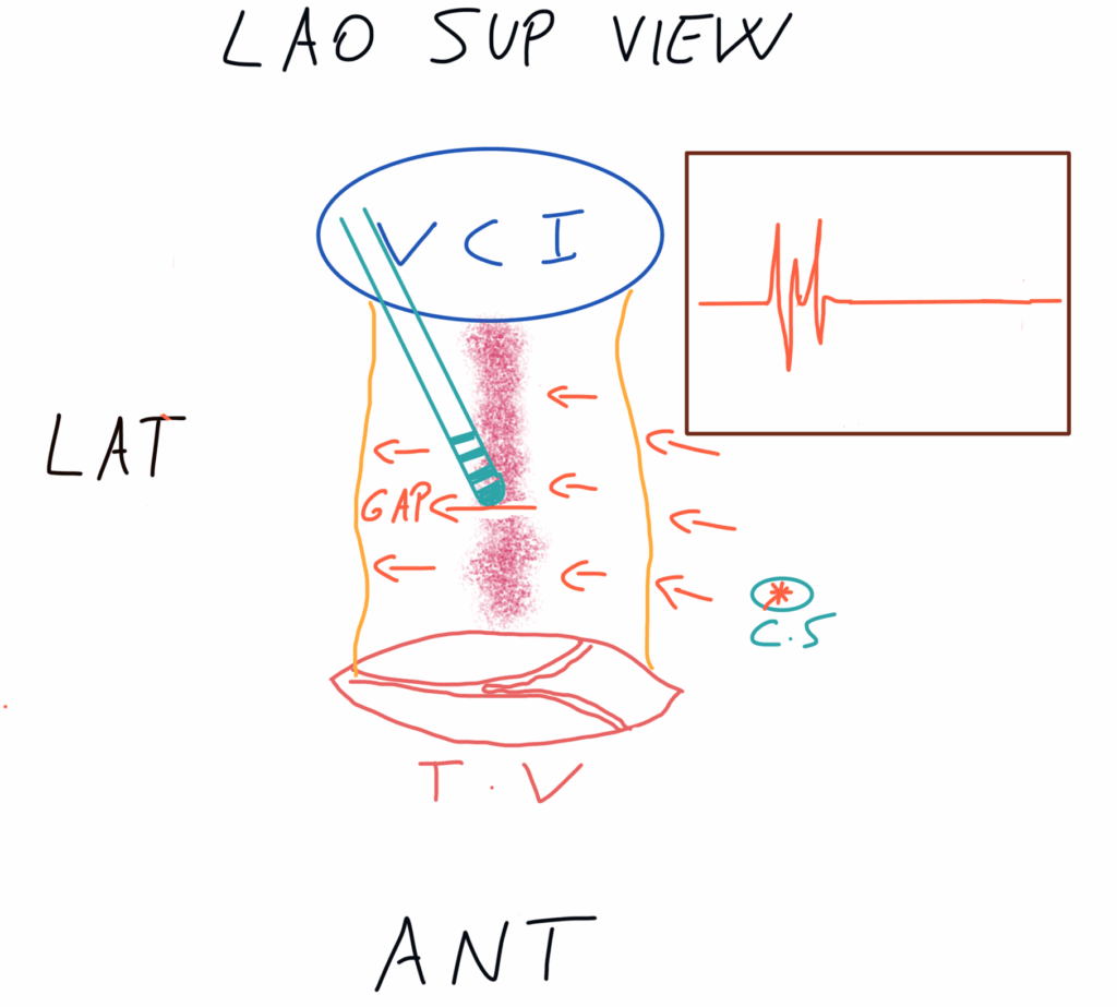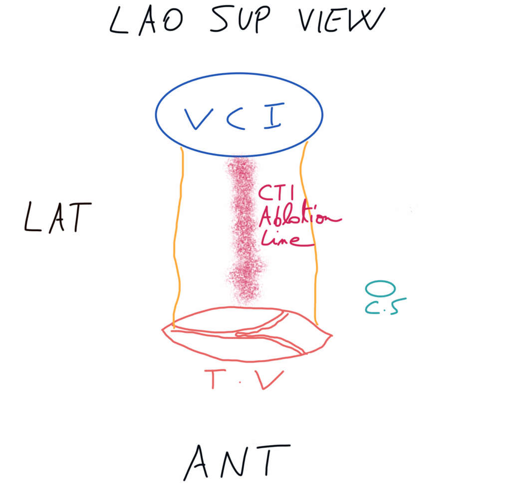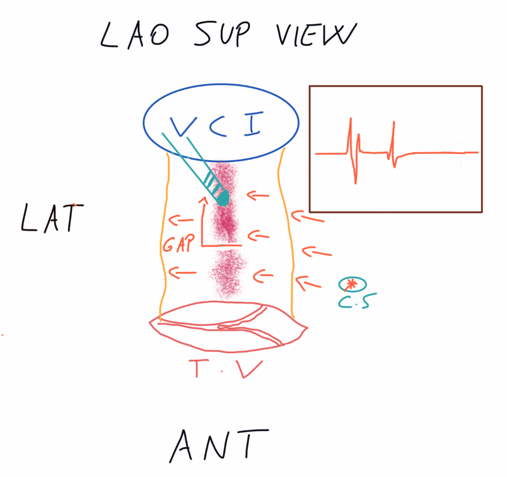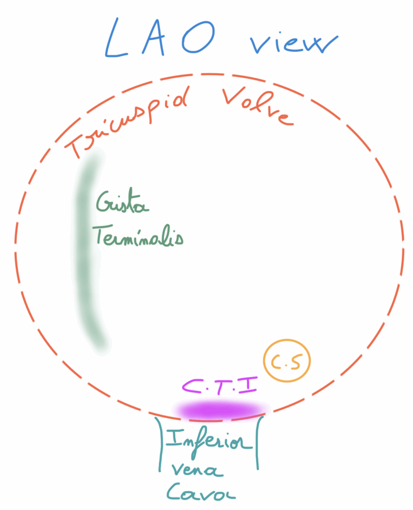 The area of interest is the CTI, which in the RAO view lies between the tricuspid valve and the inferior vena cava.