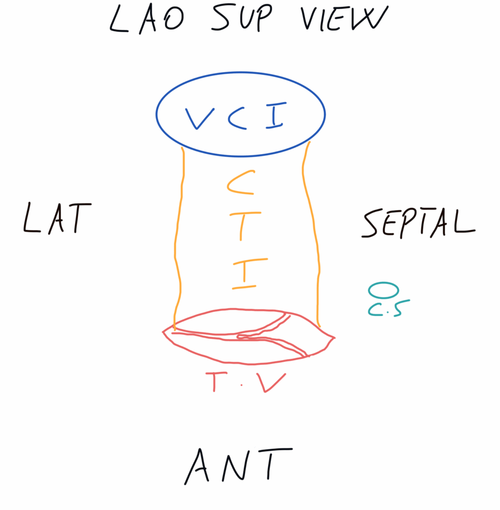 In the RAO view, the CTI is divided from front to back into anterior, middle, and posterior portions. It originates at the tricuspid valve and can extend toward the inferior vena cava.