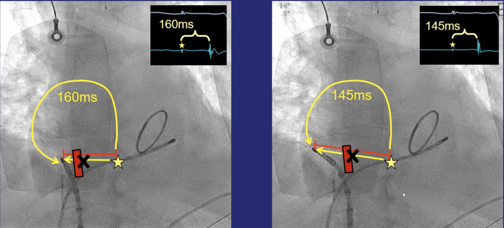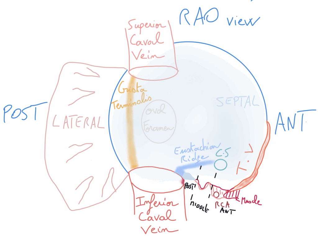 Here you have an RAO view. In front of us, we are looking at the septal aspect of the right atrium. On the right side, you can see the tricuspid valve with the right ventricle superior to it, and inferiorly the superior and inferior vena cava, respectively.