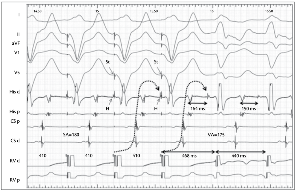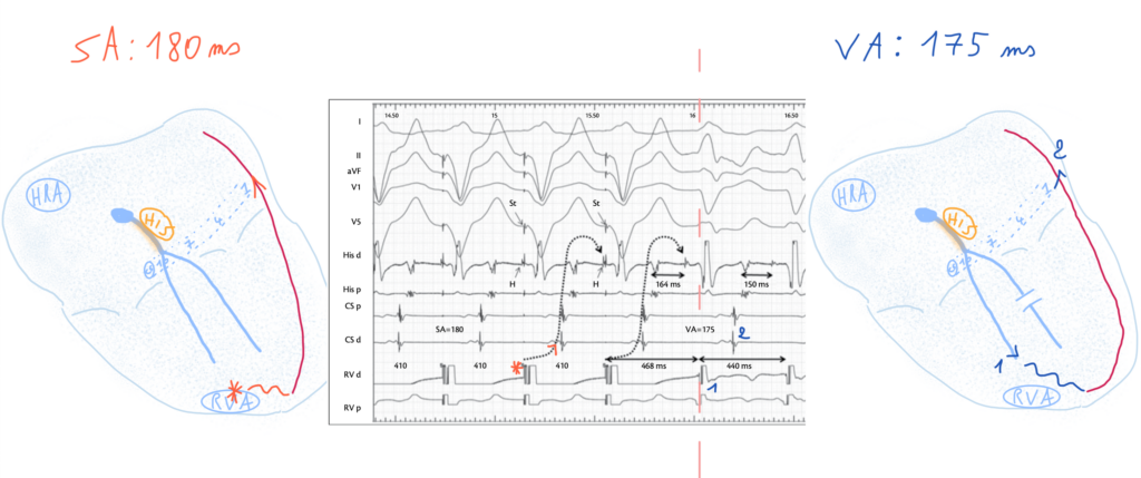 What is interesting to note is that on the left, we have ventricular pacing with an SA interval of 180 ms during orthodromic stimulation, as the His activation occurs antegradely via the atrium. On the right, there is development of a left bundle branch block during the tachycardia, with a VA interval of 175 ms. The SA and the VA intervals remains unchanged because, due to the left bundle branch block, the tachycardia follows almost the same pathway as during right ventricular pacing.